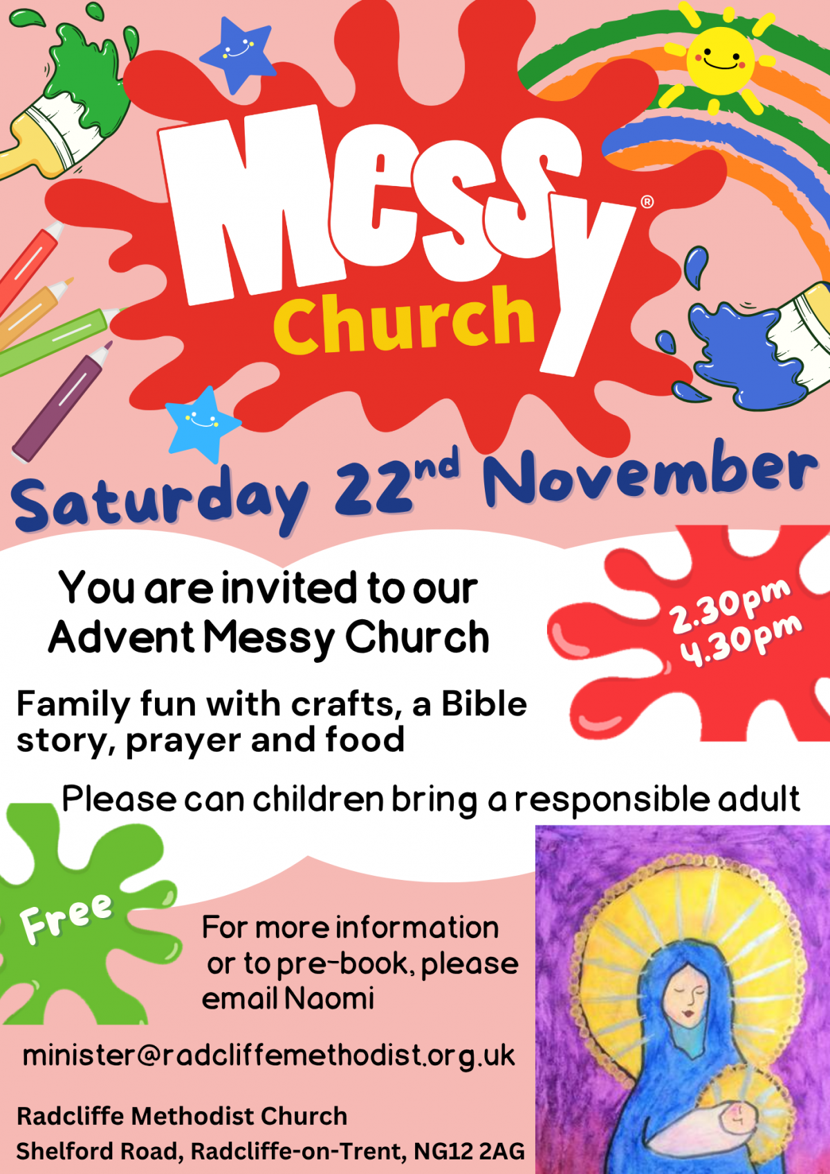 Messy Church- Saturday 22nd NovemberSaturday, 22nd of November 20252:30pmContact name:Radcliffe Methodist ChurchLocation:Radcliffe Methodist Church