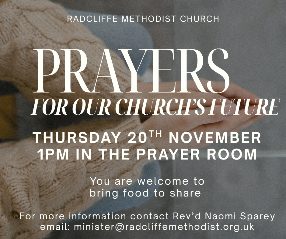Prayers for our Church's FutureThursday, 20th of November 20251:00pmContact name:Radcliffe Methodist ChurchLocation:Radcliffe Methodist Church